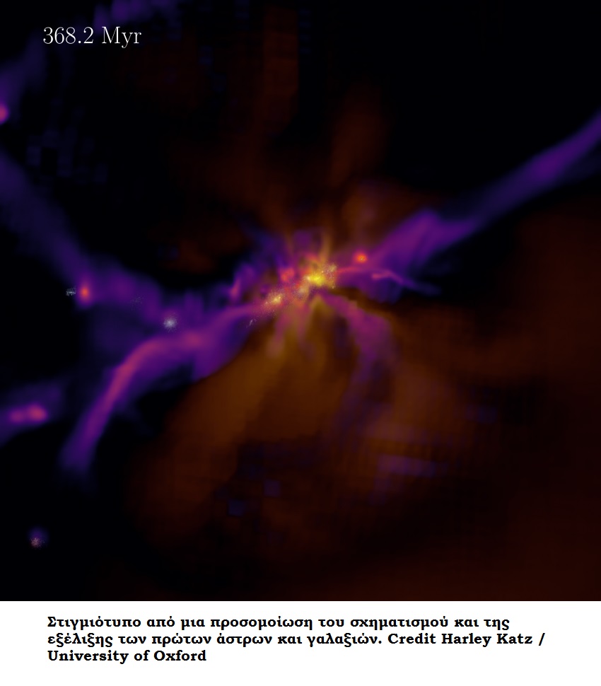 Στο παραπάνω βίντεο βλέπουμε μια προσομοίωση του σχηματισμού και της εξέλιξης των πρώτων άστρων και γαλαξιών. Ξεκινά λίγο πριν την κοσμική αυγή, όταν στο σύμπαν δεν υπήρχε το φως άστρων και φτάνει μέχρι 550 εκατομμύρια χρόνια μετά την Μεγάλη Έκρηξη, όταν ήδη έχουν σχηματιστεί οι έξι γαλαξίες που αναλύθηκαν από τον αστρονόμους. Η ηλικία του σύμπαντος σε εκατομμύρια χρόνια εμφανίζεται πάνω αριστερά. Οι μωβ περιοχές αποκαλύπτουν την νηματοειδή κατανομή του αερίου που αποτελείται κυρίως από υδρογόνο. Οι λευκές περιοχές παριστάνουν φως άστρων και οι κίτρινες περιοχές την ακτινοβολία υψηλής ενέργειας από τα μεγαλύτερης μάζας άστρα, η οποία ιονίζει το περιβάλλον αέριο υδρογόνο.