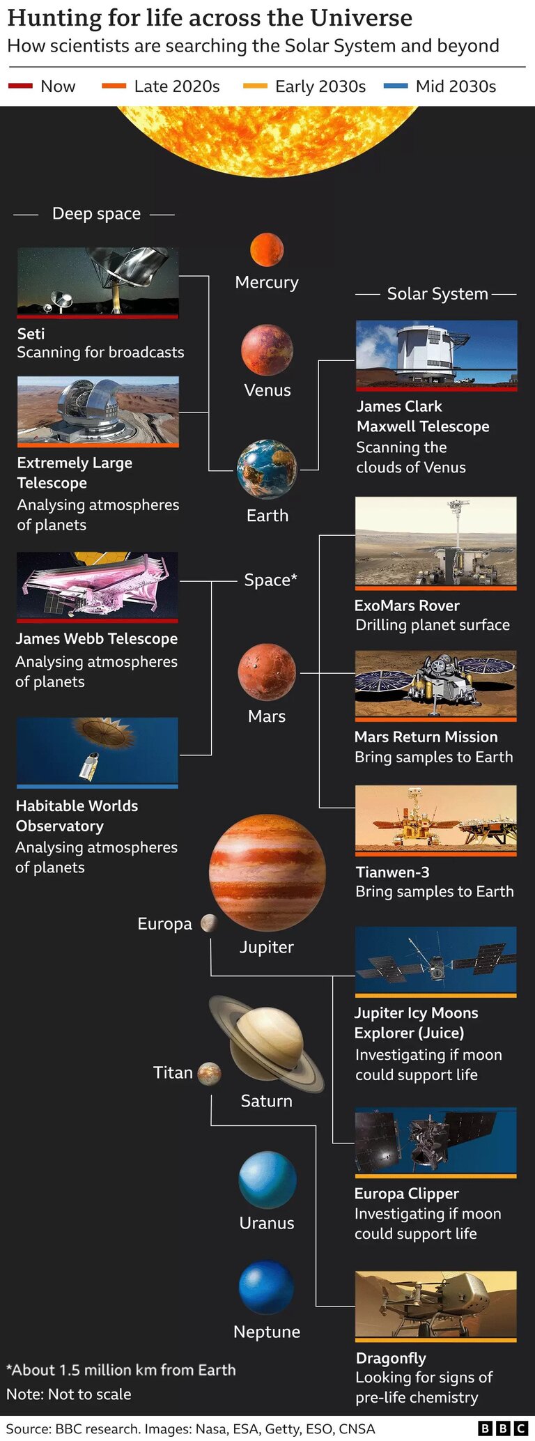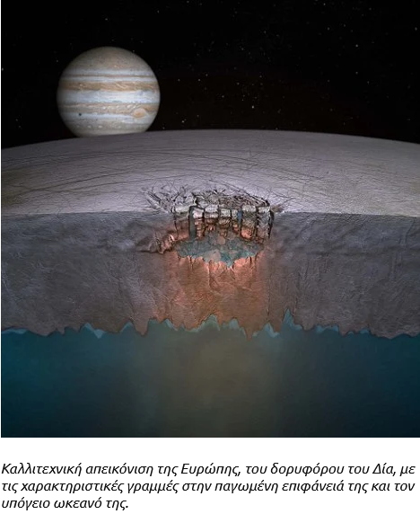 Ενώ κάποιοι κοιτάζουν σε μακρινούς πλανήτες, άλλοι περιορίζουν την αναζήτησή τους στην γειτονιά μας, στους πλανήτες του ηλιακού μας συστήματος. Είναι πολύ πιθανό να φιλοξενείται κάποιο είδος μικροβιακής ζωής σε καποιον από τους παγωμένους δορυφόρους του Δία. Ο δορυφόρος Ευρώπη, για παράδειγμα έχει έναν ωκεανό κάτω από την παγωμένη του επιφάνεια, από τον οποίο εκτοξεύονται στο διάστημα νέφη υδρατμών. Οι αποστολές Clipper της Nasa και οι αποστολές Jupiter Icy Moons Explorer (Juice) της Ευρωπαϊκής Διαστημικής Υπηρεσίας (ESA) θα φτάσουν εκεί στις αρχές της δεκαετίας του 2030.