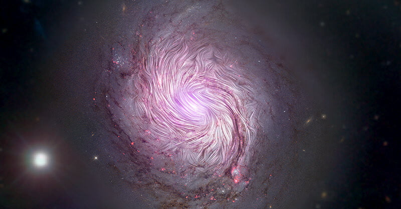 Τα μαγνητικά πεδία στον σπειροειδή γαλαξία είναι ευθυγραμμισμένα με τους βραχίονες της σπείρας κατά μήκος όλου του γαλαξία – περισσότερο από 24.000 έτη φωτός μήκος. Η ευθυγράμμιση του μαγνητικού πεδίου με την αστρική διαμόρφωση σημαίνει ότι οι βαρυτικές δυνάμεις που δημιούργησαν το σπειροειδές σχήμα του γαλαξία συμπιέζουν επίσης το μαγνητικό πεδίο. Η ευθυγράμμιση υποστηρίζει την κύρια θεωρία του πώς οι βραχίονες οδηγήθηκαν στο σπειροειδές σχήμα τους γνωστή ως «θεωρία των κυμάτων πυκνότητας». Οι επιστήμονες μέτρησαν τα μαγνητικά πεδία κατά μήκος των βραχιόνων της σπείρας του γαλαξία NGC 1068, ή M77. Τα πεδία φαίνονται σαν γραμμές ροής που ακολουθούν κοντά τους κυκλικούς βραχίονες.
